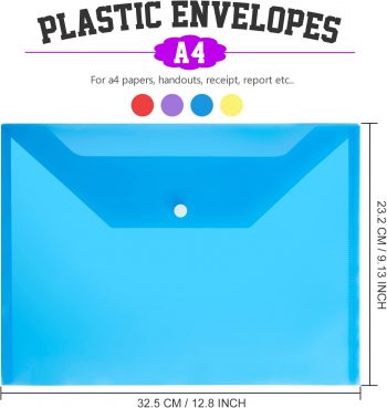 LEOBRO Plastic Envelopes with Snap Closure, 4 Pack US Letter A4 Size Plastic File Folders for Documents, Clear Envelopes Pouches Folders for School Work Office Organization, Filing Envelopes